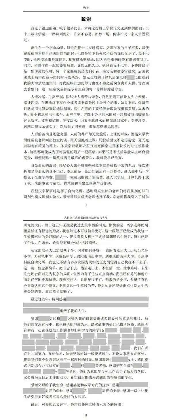 该篇致谢来自论文《人机交互式机器翻译方法研究与实现》,作者是2017年毕业于中国科学院大学的工学博士黄国平。作者在致谢中回顾了自己如何与命运抗争的故事,字字句句讲述着一位普通人受尽磨难却依然温柔、历尽千帆归来仍少年的人生历程,看哭了千万网友。