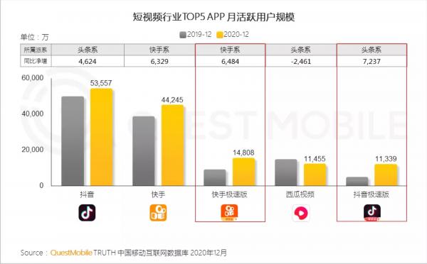 《QuestMobile2020中国移动互联网年度大报告》显示,在短视频月活跃用户规模TOP 5 中,西瓜视频紧随抖音、快手、快手极速版之后,只不过月活比2019年减少了2400多万,意味着西瓜视频“中视频”的定位在长短视频的夹击之下略显尴尬,也说明字节系短时间内也很难入侵腾讯的娱乐领地。