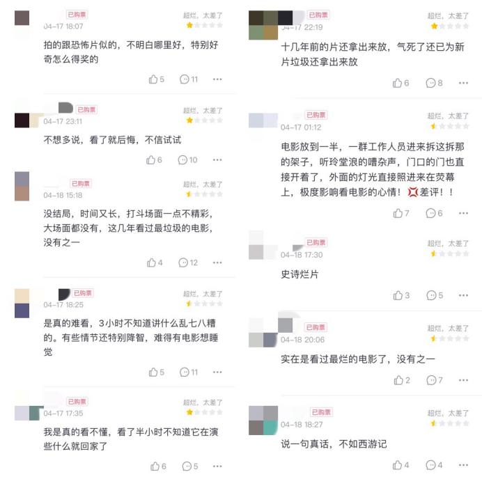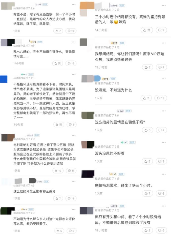 “片子太长了,剧情拖沓,看睡着了。”“看了3个小时都没有结尾,差评!”“不知道他们在干嘛,好无聊啊!”甚至还有观众说“为什么要拿老片子出来放,还以为是新片呢”,感觉自己受到了欺骗。