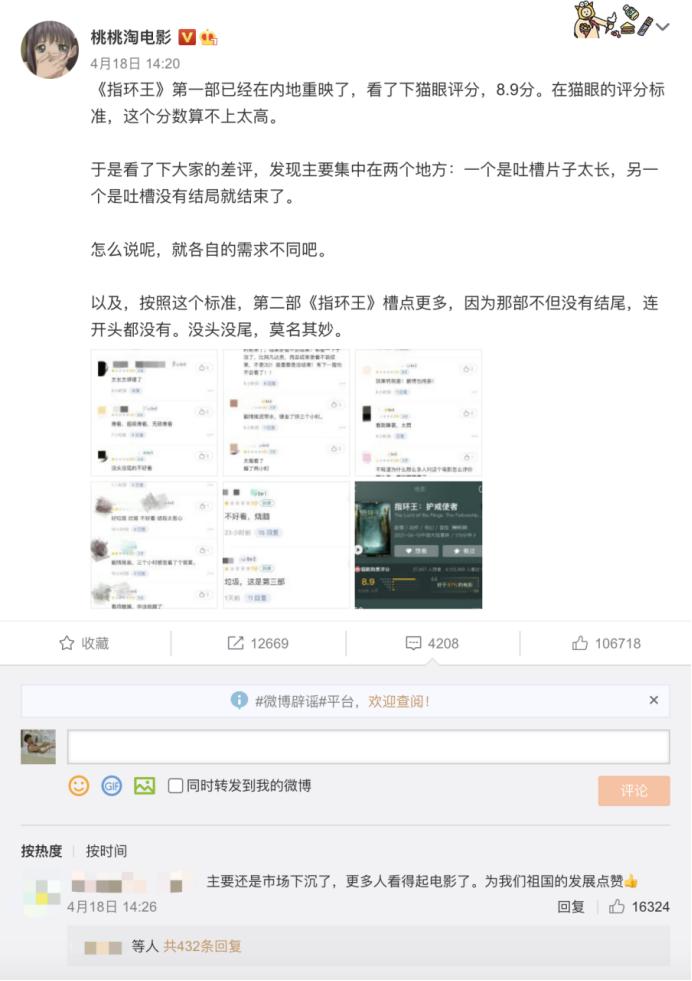 在微博知名电影博主“桃桃淘电影”发布的关于这一现象的微博下面,有一条回复得到最多赞,被顶到了最高的位置:“主要还是市场下沉了,更多人看得起电影了。”