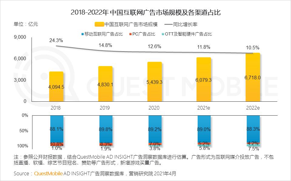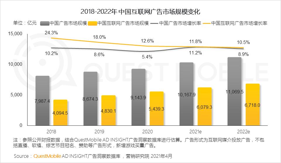 QuestMobile数据显示,2020年中国广告市场规模达到9143.9亿,其中互联网广告规模达到5439.3亿,相比2019年、2018年,保持了较快增长,尤其是互联网广告,凭借PC、移动互联网的月活用户规模、用户月人均单日使用时长的保持稳定增长,广告规模基础扎实,预计2021年,中国广告市场将突破万亿,互联网广告也将突破6000亿。