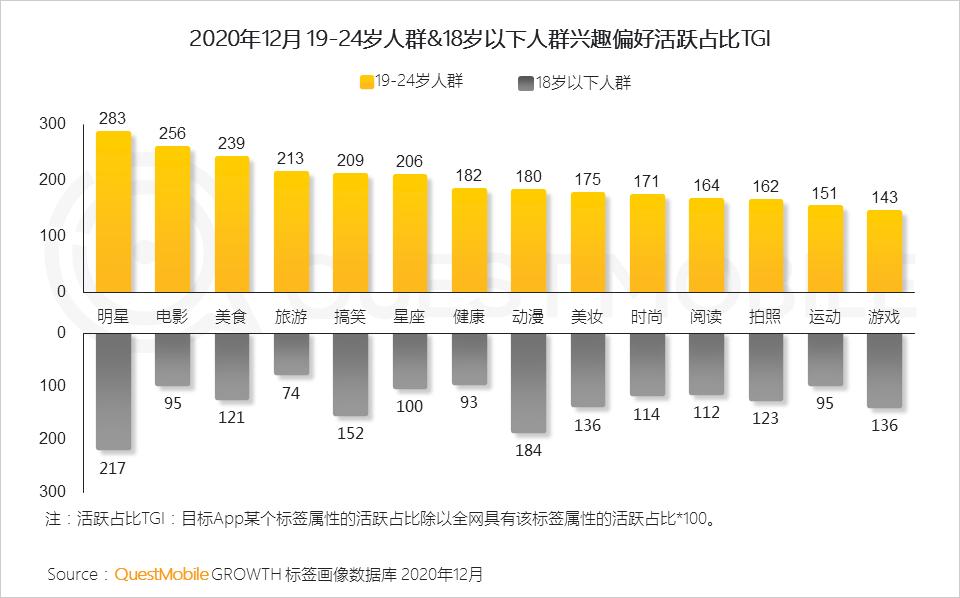 QuestMobile数据显示,2020年12月24岁以下人群活跃用户规模超过2.8亿,未来10年将成为互联网核心人群和核心消费人群。相较于年轻人群已形成与网民整体差异明显且明确的偏好,更年轻人群仅在追星、动漫和游戏上形成具个人属性的偏好,可作为有效触达的营销方式。但在其他偏好上并不明显,针对更年轻人群的营销可考虑养成与迎合并重的策略。