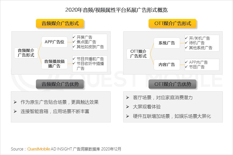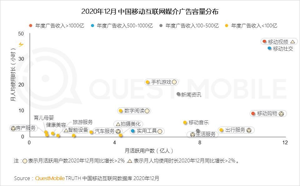 只要有流量的载体都在拓展广告变现模式,其中视频和购物属性的应用仍不断提高广告容量,此外,如游戏行业IAA+IAP(广告+内购)模式、音频行业音频广告和出行服务操作页面广告等形式,成为积极拓展广告变现模式的典型代表。
