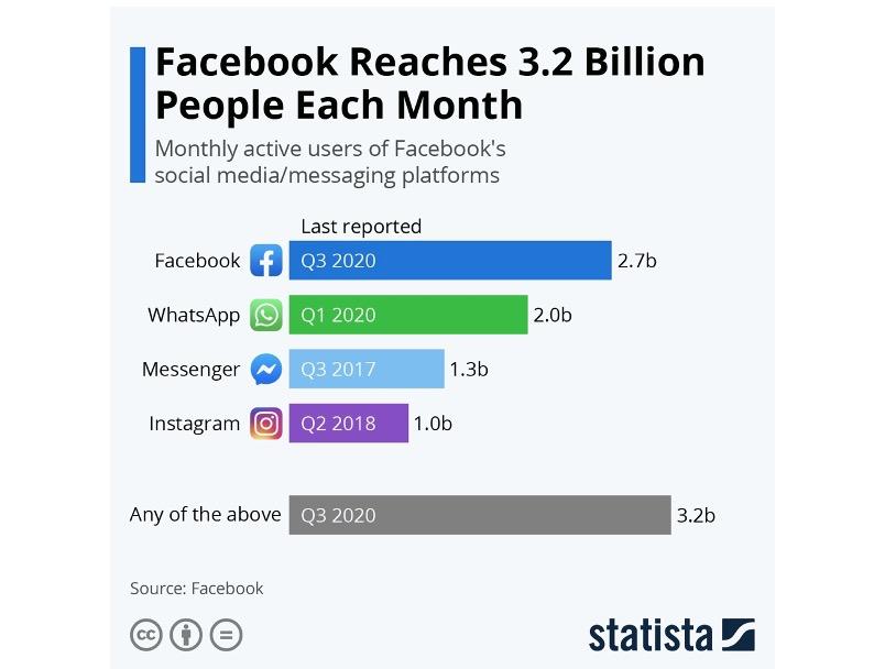 而这种收购策略在此后几年被Facebook反复使用。2014年,Facebook以190亿美元的天价收购了WhatsApp,正式建立了除Facebook主站母舰外的移动社交“三驾马车”,打造了集社交通讯(Messenger)、照片分享(Instagram)、即时通信(WhatsApp)于一体的社交矩阵。目前,几大平台每月覆盖全球超过32亿用户,让Facebook成为当之无愧的社交霸主。