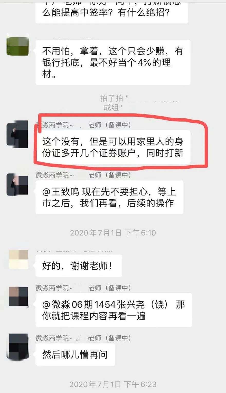 其次就是上课时,他们抛出了一个信息是,去微淼商学院那里开中信证券的户,他们可以去免掉验资。就是如果要炒港股的话,其实是需要一个50万的验资,但是通过他们去中信证券开户的话,可以免掉这个验资,我觉得这一点就是涉嫌诱导消费者。不止诱导开户,还诱导学员用家人的身份证去开户。