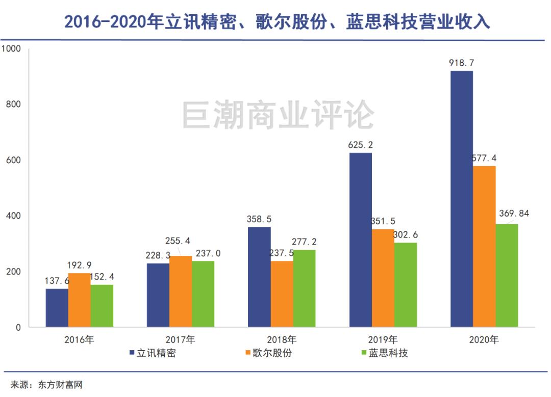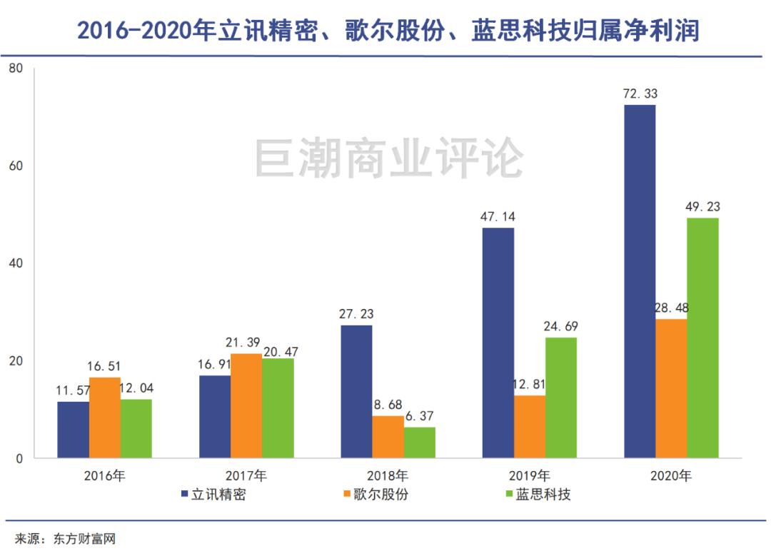 经过2019、2020年连续两年的大幅度上涨,歌尔股份股价累积涨幅超过550%,立讯精密涨幅600%,蓝思科技累积涨幅也接近500%。“果链三傻”不长时间里累积出的巨大股价涨幅,足以透支任何业绩上的利好。