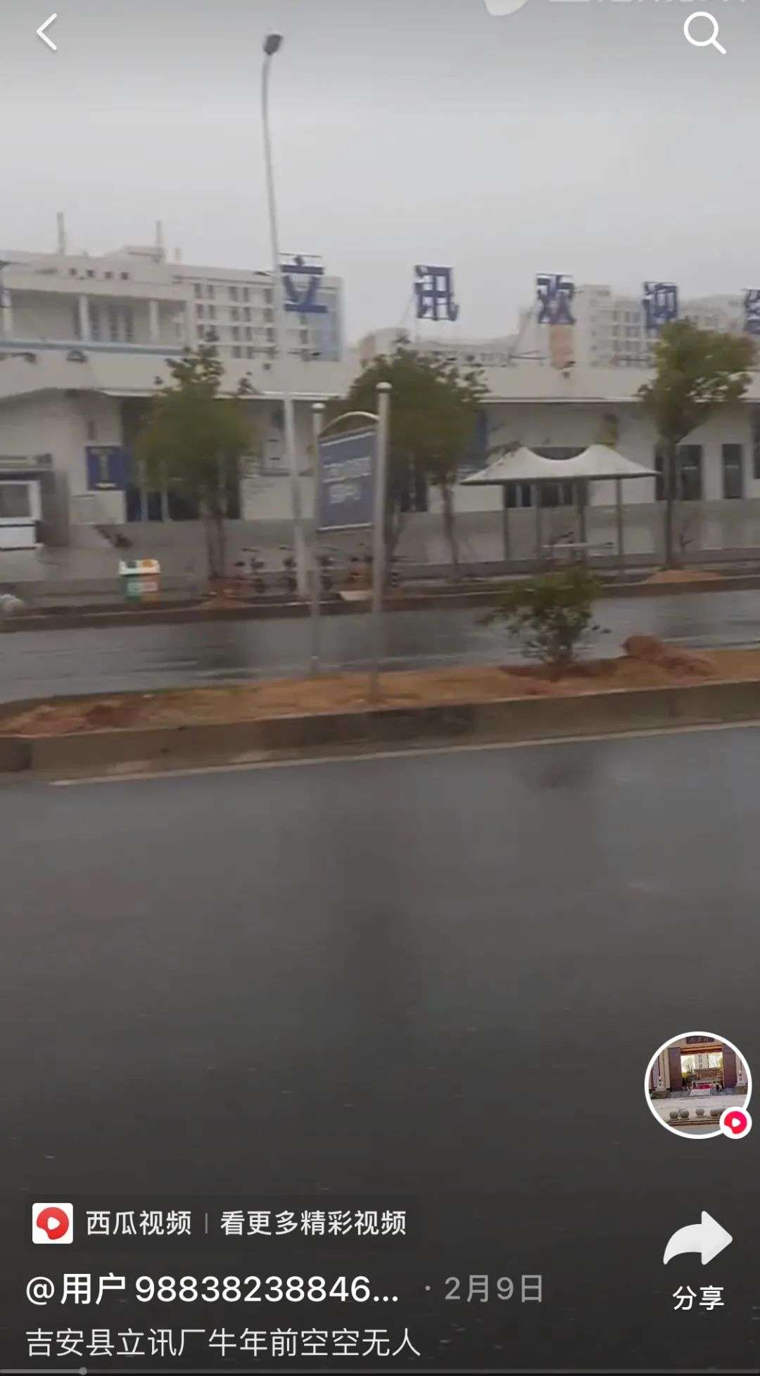 类似的事情也发生在“果链龙头”立讯精密(SZ:002475)身上。2月9日,有抖音用户发布短视频,称吉安县立讯厂区“年前空空无人”,配上了一片萧条的镜头画面。