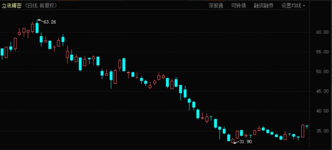2021年1月14日-2021年3月24日,立讯精密股价直线滑落,从最高63.26元跌至最低32.37元,最深跌幅47.83%近乎腰斩。