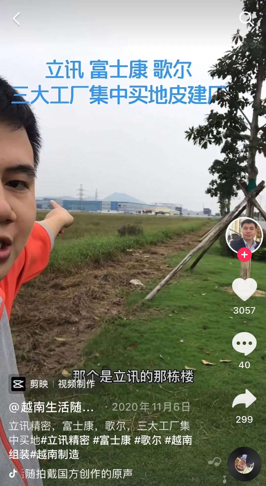 抖音用户“越南生活随拍戴国方”介绍越南果链企业厂地