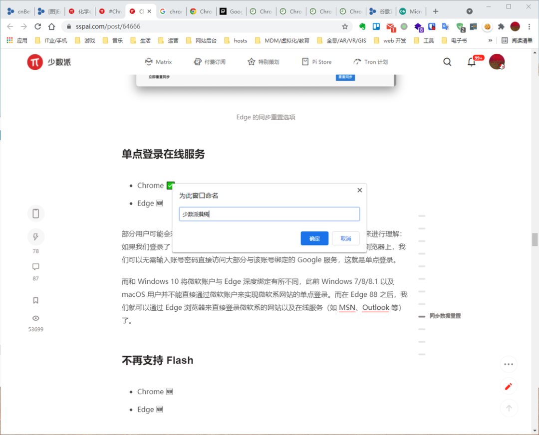 顾名思义,窗口命名允许我们对浏览器窗口的名称进行自定义,我们只需要在 Chrome 窗口的空白处点击右键,然后选择「为窗口命名」即可。虽然由于 Chrome 本身的设计命名后窗口名称的可见性依然较低,但当我们将鼠标移至 Windows 任务栏上时,还是可以看到不同浏览器窗口所对应的名称。