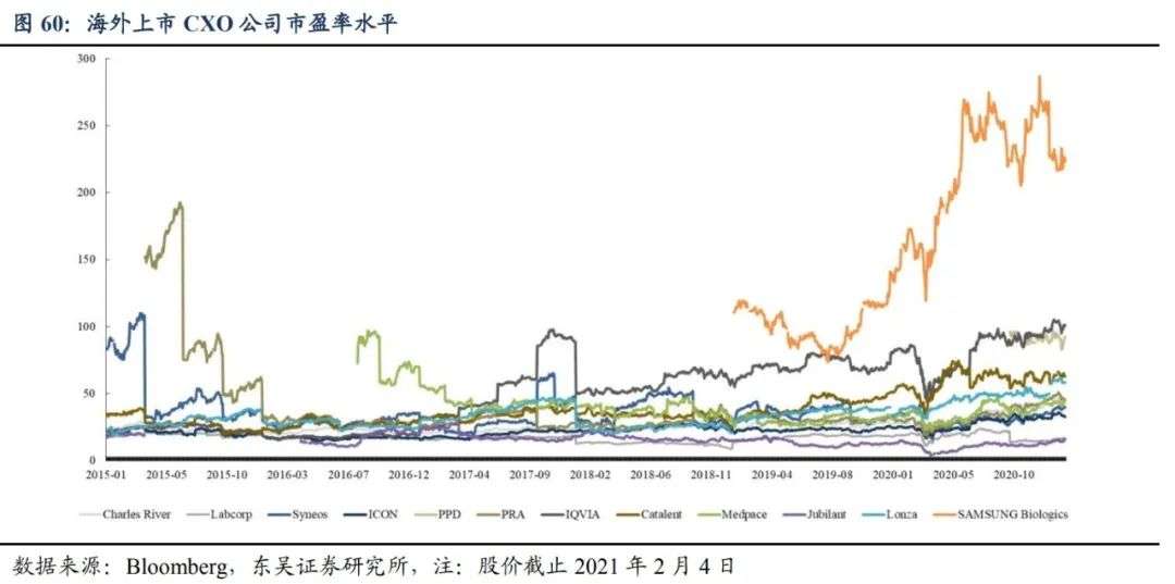 这与海外CXO企业形成了较大差异。东吴证券研报统计,海外CXO企业普遍处于30-60倍的估值区间,而中国CXO公司动辄估值在100倍以上,普遍处于70-150倍的估值区间。