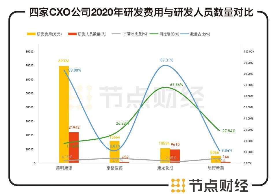 泰格医药研发费用达到1.57亿元,同比增长26.28%,占总营收的4.91%,研发人员达到652人,数量占比为10.81%。康龙化成研发费用达到1.05亿元,同比增长67.56%,占总营收的2.05%,研发人员达到9615人,数量占比为87.31%。昭衍新药研发费用达到0.51亿元,同比增长27.84%,占总营收的4.74%,研发人员达到146人,数量占比为9.84%。