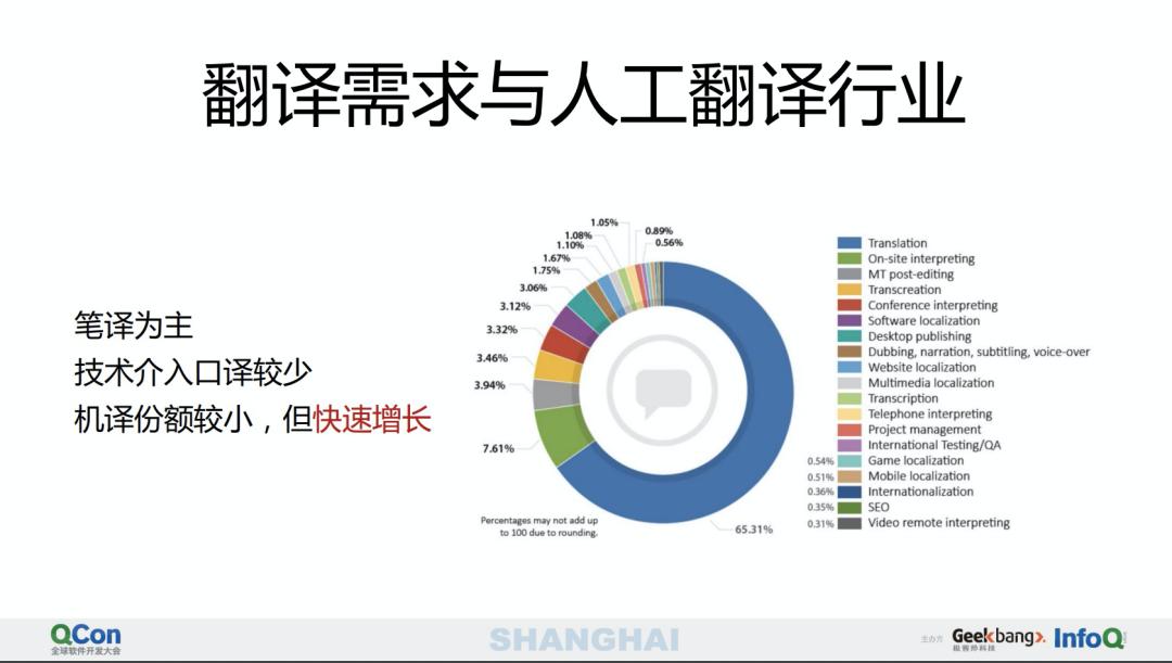 我这里有个非正式的数字,就是口译(包括了传和同传)这两个加起来的话,不超过整个市场份额的 15%,也就是说笔译是超过 80% 的。