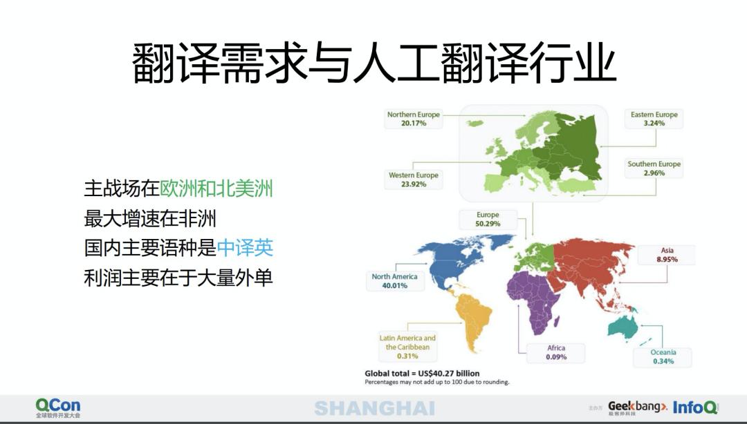 这里其实有一个专门的行业,人工翻译行业。这个图标明了全球各个国家人工翻译行业占整个产业的产值,我们大家可以看到一个很触目惊心的事实,就是,欧洲和北美洲加起来超过了全球翻译市场总量的 90%,然后整个亚洲占比百分之九点几的样子。