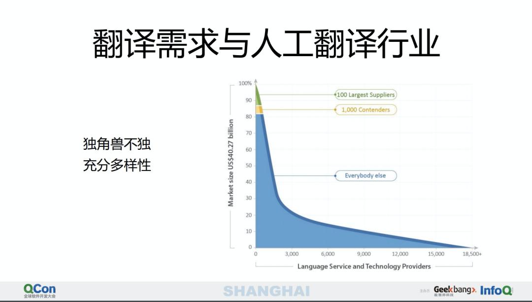 然后收回到人工翻译行业的话,它有一个很有趣的现象,这也是我为什么愿意把我的主要精力花在人机交互机器翻译上,因为人机交互机器翻译主要强调的是人机结合。这个行业有一个很重要的现象,叫独角兽不独,充分多样性。多样性到啥程度?前 10% 的翻译服务公司加起来的市场份额不超过 15%。
