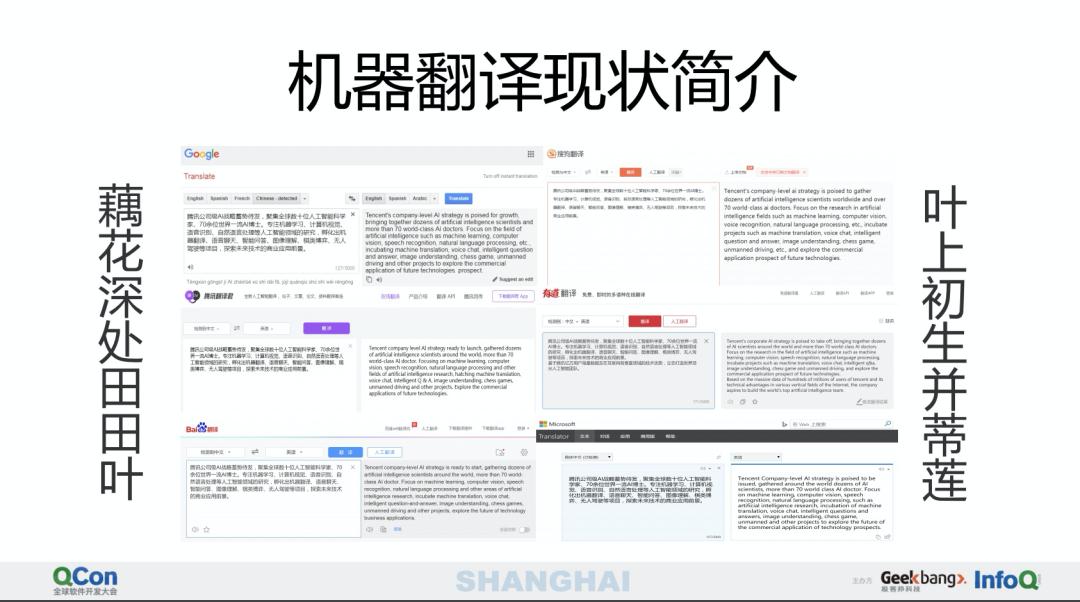 我相信大家在阅读文献的时候,或者去查找资料的时候,或多或少都会用到机器翻译,比如说比较出名的也是比较早的谷歌翻译,然后有百度翻译。后面也出现了很多机器翻译产品,比如搜狗,还有腾讯翻译君。我把所有这些截图再放在一起的话,大家也觉得左右两边应该是概括得比较准确的,就是说“藕花深处田田叶,叶上初生并蒂莲”。大家都像双双胞胎兄弟似的,好像也看不出来什么区别。