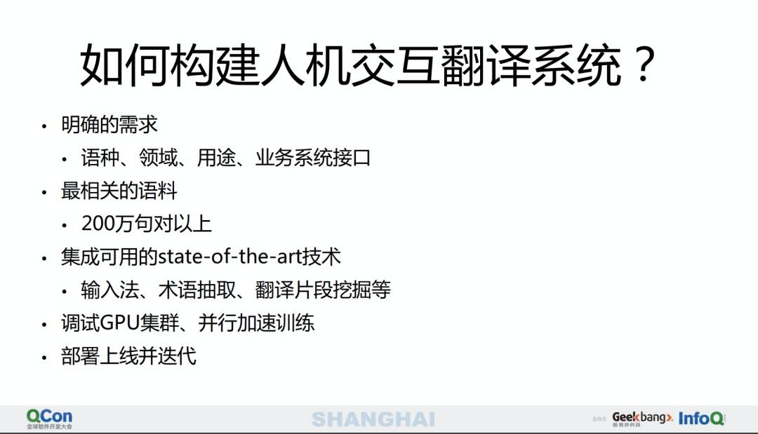 我们前面讲了这么多技术,如何去构建一套人机交互方案系统来满足当前业务的需求呢?我简单总结一下的话,就是说为了供应这个系统,首先是要有明确的需求,所谓需求就是语种、领域、用途、业务系统的接口等;其次要有语料准备;还有一个大头就是如何集成可用的 State-of-the-art 的技术,比如说输入法、术语抽取、翻译片段挖掘等;还要有一个调试 GPU 集群,部署上线并接待。看起来很简单,这其实里面很多坑。