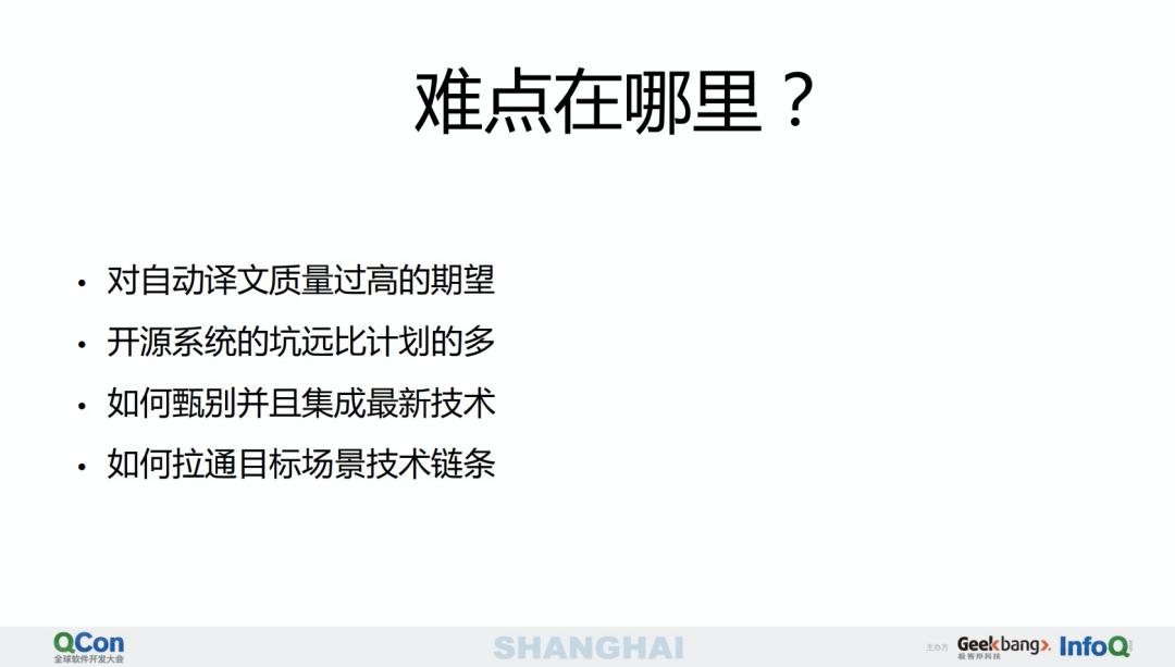 然后最后一个挑战就是说如何拉通目标场景技术链条。人机交互式机器翻译它技术链条实在太长了,涉及到就是一直到输入法,然后还有一些比较传统的统计,机器翻译的技术都要用到,还包括像约束解码这些东西,这里面会有很多那种比较艰巨的事情需要做。