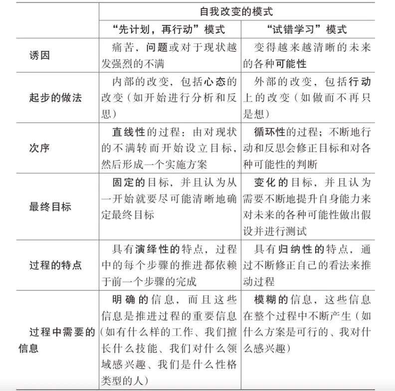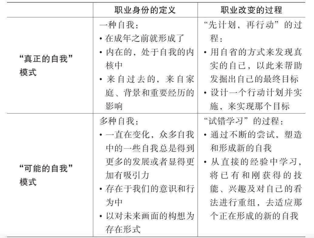 表 2 总结了「真正的自我」的职业身份的定义和「可能的自我」的职业身份的定义之间的区别,说明两者是如何与我们之前提到的「先计划,再行动」模式和「试错学习」模式分别对应的。