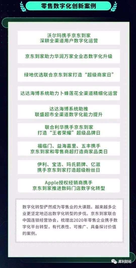 京东到家在自身415周年庆前夕,联合CCFA(中国连锁经营协会)推选了“2020年度零售数字化创新案例”,其中包括达达海博系统助力卜蜂莲花全渠道精细化运营、联合利华携手京东到家打造“王者荣耀”超级品牌日……