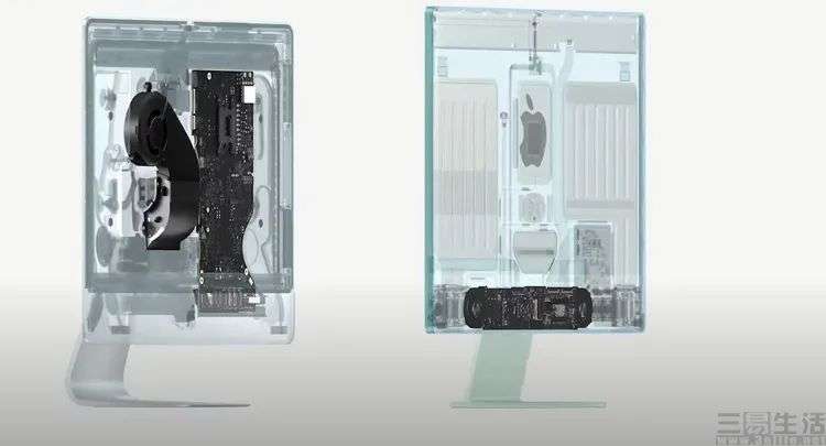 正如苹果方面在此次活动中所提到到的那样,M1让iMac实现了前所未有的内部构造革命。作为一款一体式电脑,iMac一方面实现了如同平板般纤薄的机身设计,另一方面也不再需要像其他主打超薄外观的同类产品那样,在底座部分隐藏一个厚厚的“机箱”。