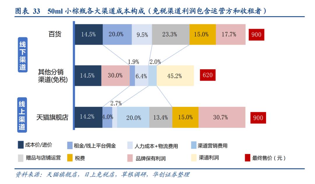 这里我们可以以雅诗兰黛小棕瓶为例来预估一下各大渠道的成本结构,数据统计来源华创证券的《商业贸易行业深度研究报告》。
