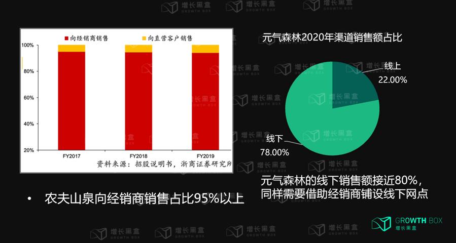 线下虽然现在还是主流,但我们认为趋势毋庸置疑:元气森林22%的线上化率已经远超同行5%的线上化率,这也证明了新物种在DTC模式上的侧重。更有传闻,元气森林将在线下铺8万个智能冰箱,更加敏捷地收集终端的销售数据。