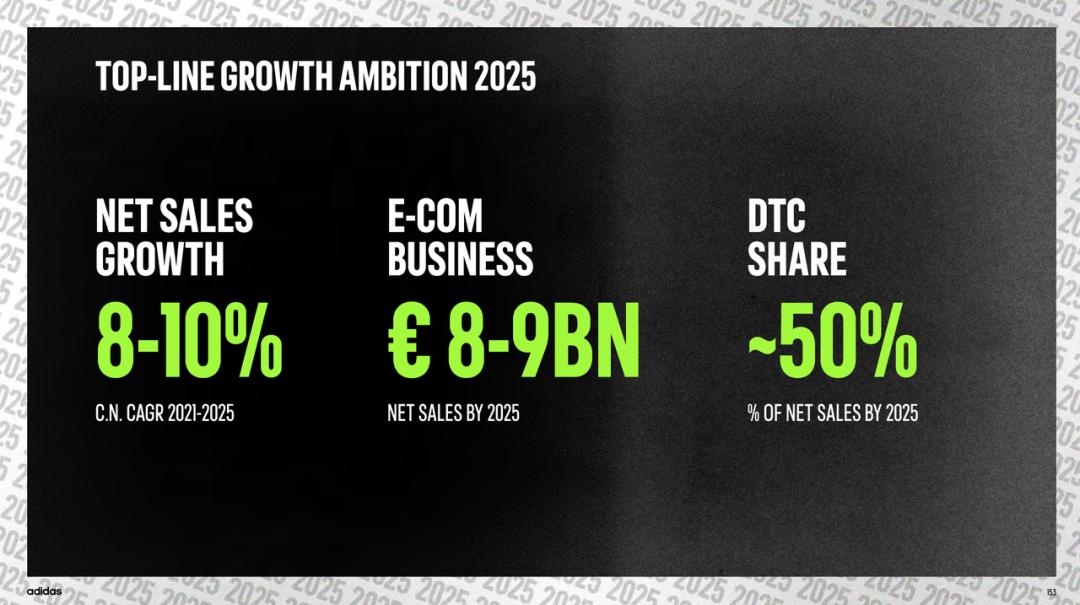 其中,阿迪达斯直接向终端用户销售(DTC)的比例要在2025年超过50%。同时,电子商务渠道要在2025年销售到80-90亿欧元,换算一下约600亿人民币。