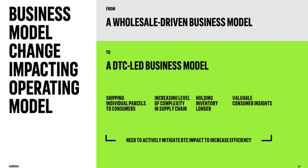 同时,我们分析了很多前沿公司的战略规划,发现他们几乎无一例外将DTC模式定位为未来主要的增长点。例如最近Adidas的CFO在投资者日披露了公司未来的计划:Adidas将在在5年内,从经销商模式转为DTC模式。