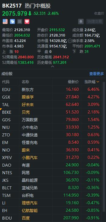 大型中概股,阿里巴巴跌2.09%,京东跌3.12%,拼多多跌5.41%,哔哩哔哩跌4.81%,腾讯音乐跌4.71%,百度跌0.91%,好未来涨3.09%,新东方涨6.46%,贝壳涨2.18%。