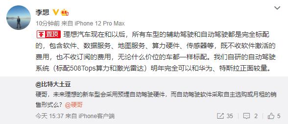 $理想汽车(LI.US)$CEO李想在微博表示,理想汽车现在和以后,所有车型的辅助驾驶和自动驾驶都是完全标配的,包含软件、数据服务、地图服务、算力硬件、传感器等,既不收软件激活的费用,也不收订阅的费用,无论什么价位的车都一样标配。