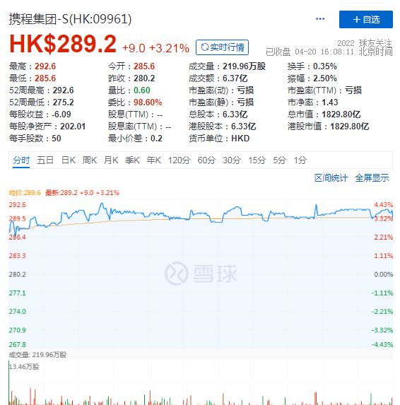 4月20日,携程登陆港交所的第二个交易日,最高每股报292港元,截至收盘每股报289.2港元,较发行价每股286港元上涨7.91%,市值达到1829.8亿港元。