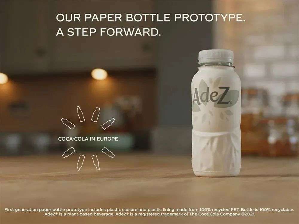 还有,为了增强大众的环保意识,可口可乐今年还在匈牙利市场,为旗下植物饮料ADEZ量身定制推出了环保「纸瓶」,全身采用了北欧木浆纸制作而成,100%可以回收,算是纸质瓶可行性的初次尝试。