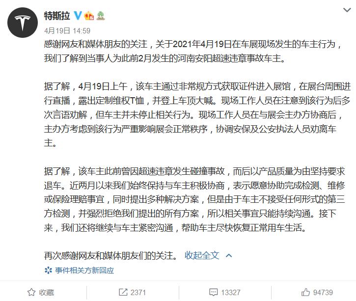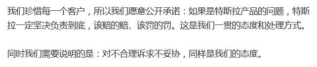 当日下午,特斯拉在官方微博上对此事两度回应。除了介绍了该事件的缘由外,特斯拉方面还表示,“如果是特斯拉产品的问题,特斯拉一定坚决负责到底,该赔的赔、该罚的罚。对不合理诉求不妥协,同样是我们的态度。”