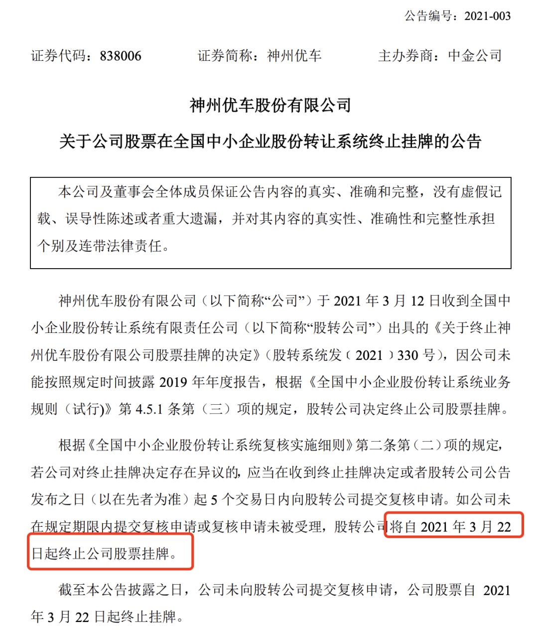 3月22日,神州优车因无法按时披露2019年年报,被新三板终止挂牌。