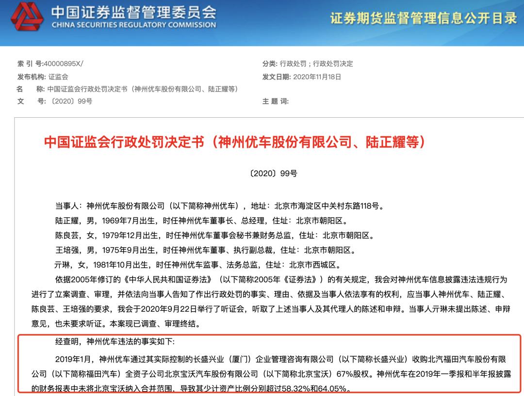 更耐人寻味的是,去年11月25日,在发布拟将神州租车股权转让给Indigo Glamour Company Limited后的15天,神州优车收到证监会的行政处罚决定书,称神州优车在2019年一季报和半年报披露的财务报表中未将北京宝沃纳入合并范围,导致其少计资产比例分别超过58.32%和 64.05%。
