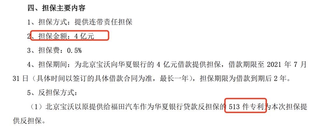 北汽福田在《为北京宝沃4亿元借款提供担保的议案》中提到,北京宝沃以原提供给福田汽车作为华夏银行贷款反担保的513件专利为本次担保提供反担保。