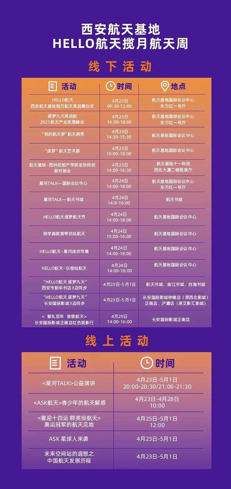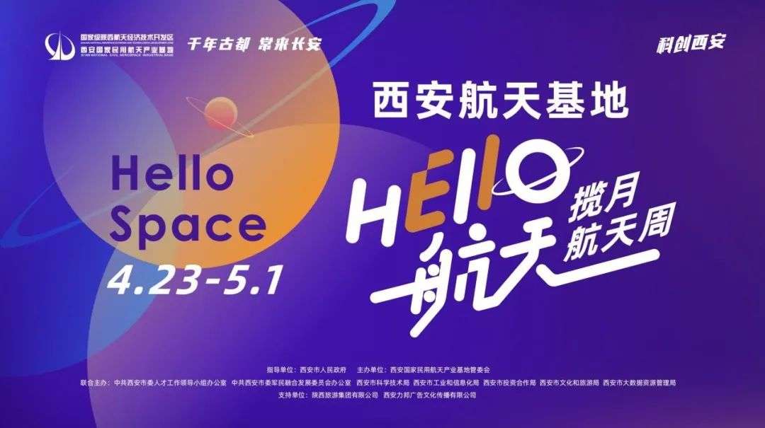 为弘扬航天精神,致敬航天英雄,建设航天强国,值此2021年4月24日第六个 “中国航天日” 到来之际,由西安市人民政府指导,西安航天基地管委会主办,中共西安市委人才工作领导小组办公室、中共西安市委军民融合发展委员会办公室、西安市科学技术局、西安市工业和信息化局、西安市投资合作局、西安市文化和旅游局、西安市大数据资源管理局联合主办的 “HELLO航天 揽月航天周” 将于 2021年4月23日至5月1日 在航天基地盛大举行。