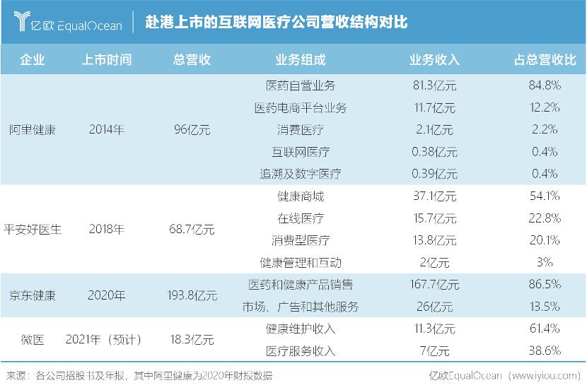 阿里健康超过90%收入来源于医药销售;京东健康86.5%的收入来自医药和健康产品销售;在线医疗、消费医疗、健康管理加起来贡献了30亿收入的平安好医生,另外超过50%(37.1亿)的收入也源于包括医药、保健品、医疗器械、母婴育儿、运动健身等在内的健康商城。