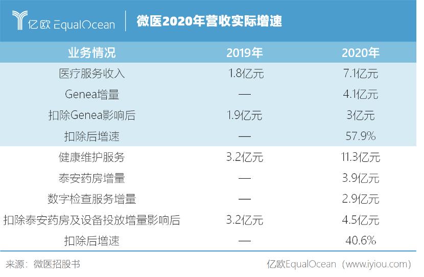 2020年,微医营收从上一年的5.06亿元增加到18.32亿元,增幅达262.1%。这主要是收购Genea、泰安药房业绩并表以及数字检查设备投放带来的增量,倘若去掉这些业务,其收入增幅显然没有这么“美好”。