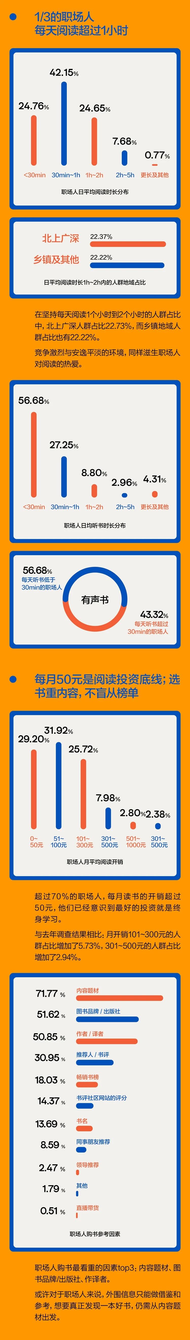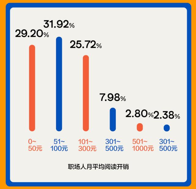 超过70%的职场人,每月读书的开销超过50元。不过更值得点赞的是:月购书开销100-300元的人群,占比增加了约6%;月购书开销300-500元的人群,占比增加了约3%。买本好书,是最好的个人投资。