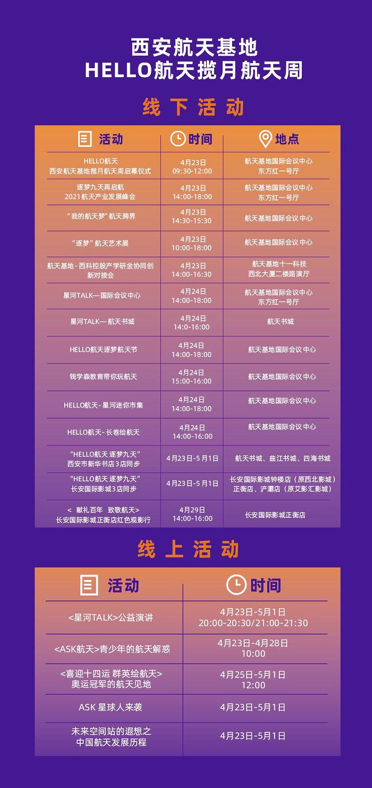 星河浩瀚无垠,探索永无止境。为弘扬航天精神,致敬航天英雄,建设航天强国,在第六个“中国航天日”到来之际,由西安市人民政府指导,西安航天基地管委会主办,中共西安市委人才工作领导小组办公室、中共西安市委军民融合发展委员会办公室、西安市科学技术局、西安市工业和信息化局、西安市投资合作局、西安市文化和旅游局、西安市大数据资源管理局联合主办的“HELLO航天 揽月航天周”将于2021年4月23日至5月1日在西安航天基地盛大举行。