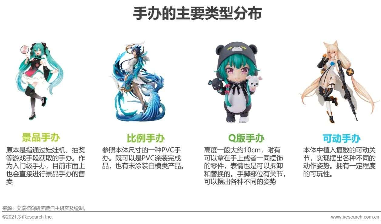 手办来源于日语词汇,本意是指没有涂装的模型套件。在二次元文化的风行下,逐步演变成通过树脂、聚氯乙烯、乙烯基苯等材料开模制作,以及涂装等工序后制成的人物模型。本次报告的研究对象中,不含盲盒、扭蛋、食玩等潮流玩具手办类型。具体手办研究类型如下: