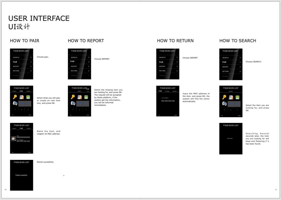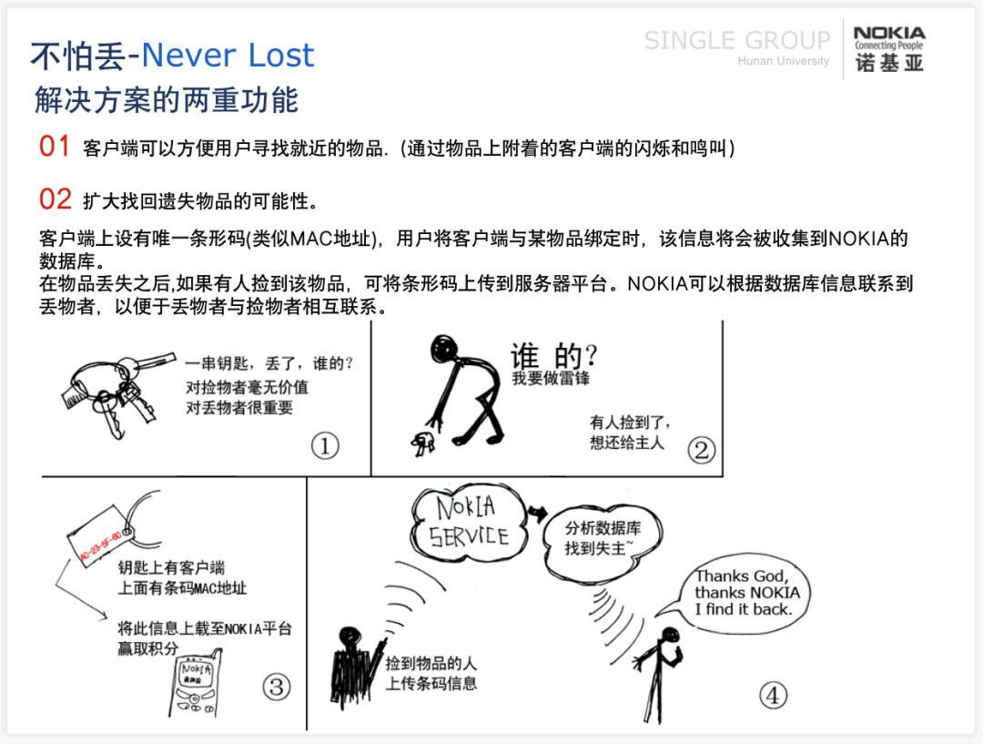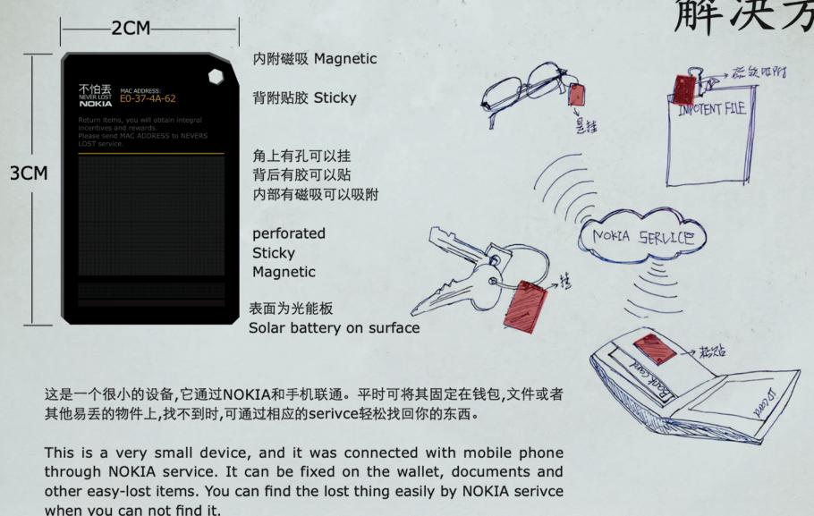 在两个月的时间里,项目小组讨论并执行了三套方案。我提议了一个名为 「NeverLost」 的概念:通过一个贴片与智能手机应用(App)相联结的方式,可以实现寻找物品定位的功能 —— 与今天发布的 AirTag 如出一辙。