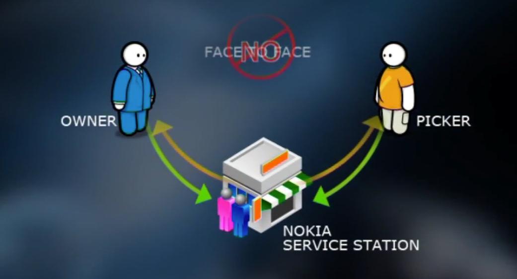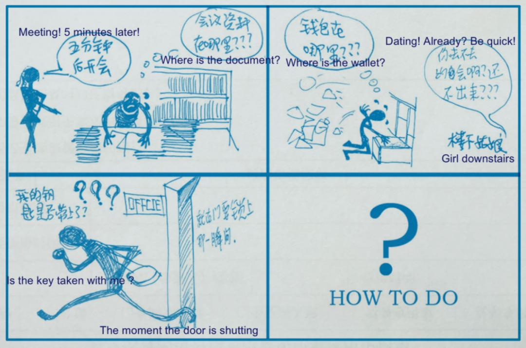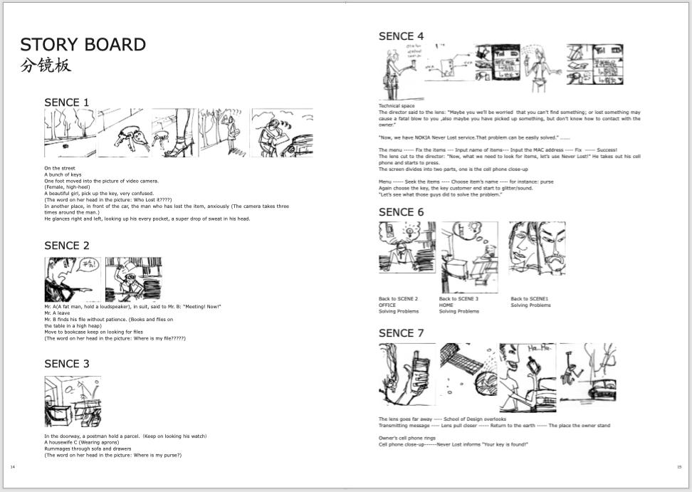 我们设想了三个故事场景并进行了视频拍摄:第一个场景是某位白领在会前疯狂地找文件,第二个场景是主妇在支付快递费时找不到钱包(那时还没有移动支付),这两个场景都属于「找不到」的状况。第三个场景则在一位车主丢失了钥匙,而捡物者则通过 NOKIA 的社会化网络寻物平台将钥匙送还给了失主的故事。