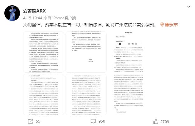 4月15日,辛巴的前徒弟,在快手拥有962万粉丝的安若溪发布微博表示,“我们坚信,资本不能左右一切,相信法律,期待广州法院秉公裁判。”