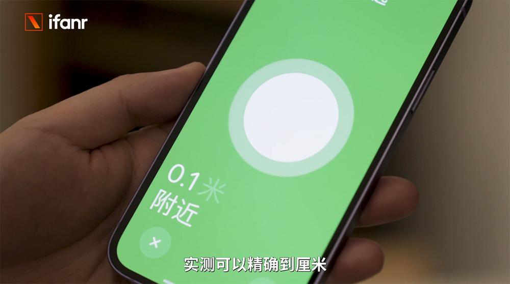 注意看,一开始,屏幕只会显示距离,当你靠近的时候,屏幕直接弹出了方向箭头,视觉+声音+震动同时反馈,引导你靠近 AirTag。实测可以精确到厘米。