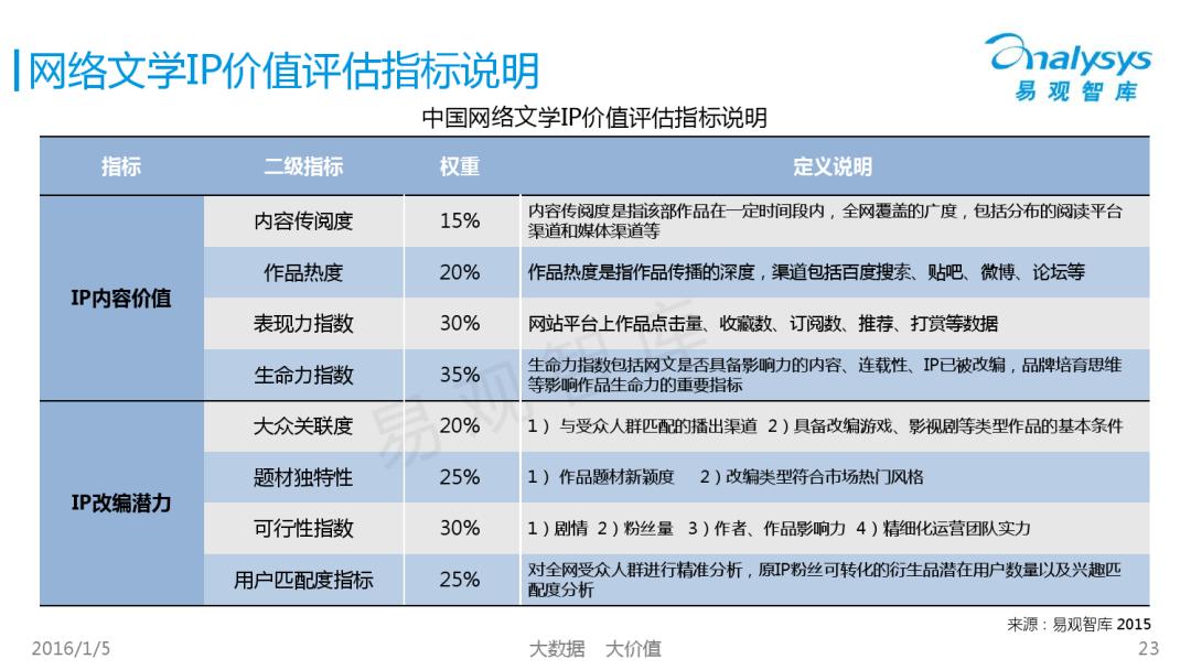 易观曾于《2015年中国网络文学IP价值研究及评估》报告中提出8个评估指标,除了站内数据与站外传播之外,题材独特性与拥有的粉丝量也是其中的关键词。而这,很可能是免费阅读先天欠缺的东西。