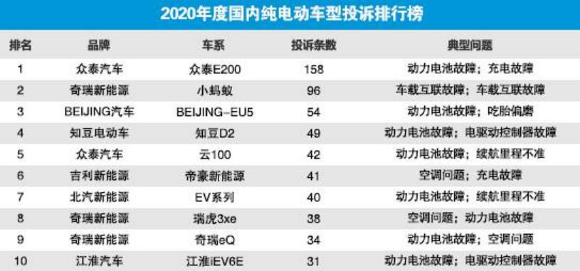 而当下正值新能源汽车放量阶段,因此各种问题出现的频率也会增加。公开信息显示,车质网2020年国内纯电动车总投诉量为1837宗,与2019年相比增加434宗,上涨30.9%。其中,至少发生过一次车主投诉的纯电动车型有153款,较2019年增加42款车型。
