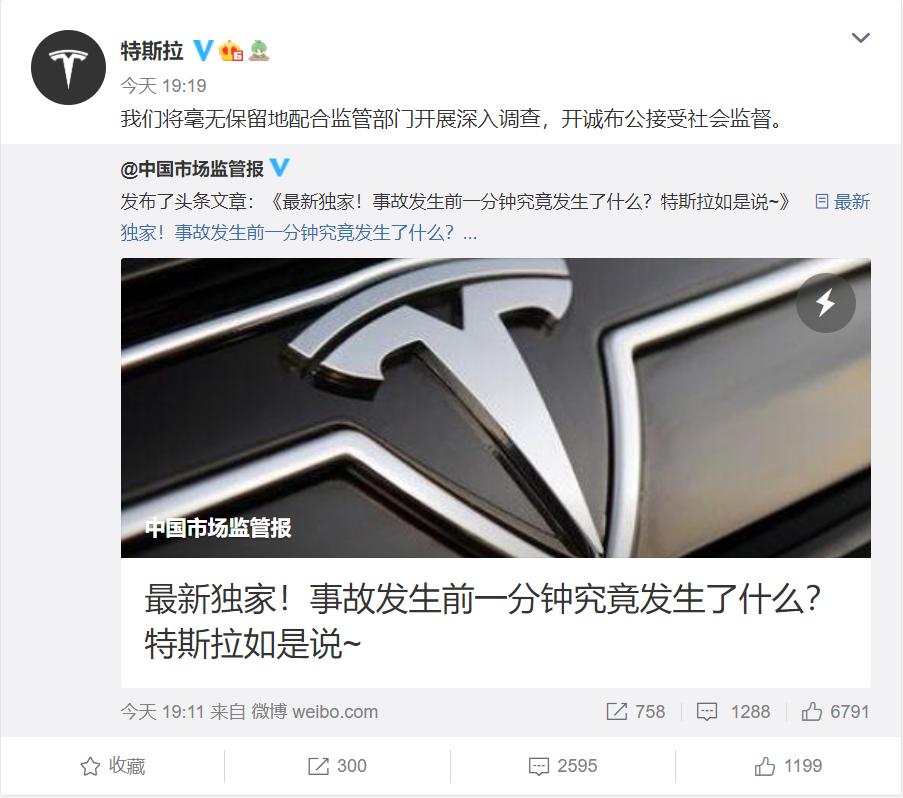 4月21日深夜,特斯拉在微博上向公众汇报了专门处理小组的最新进展:已主动与郑州市市场监督管理局联系并汇报相关情况,愿意提供事发前半小时的车辆原始数据给第三方鉴定机构或政府指定的技术监管部门或者消费者本人,承担鉴定产生的全部费用,承诺接受任何检测结果。